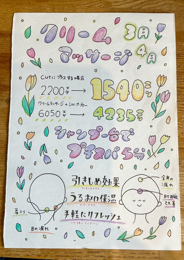 美容室ブリキでは、3月4月クリームマッサージキャンペーンを実施致します。